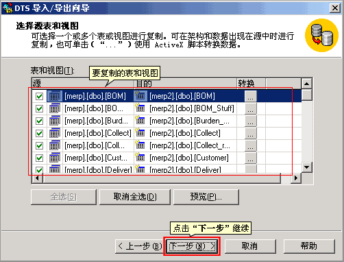 6. 选择要复制的表和视图,点“下一步”继续